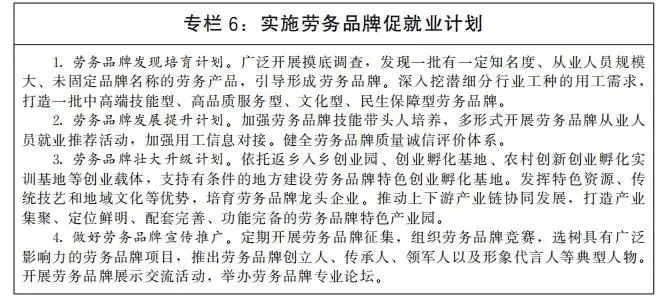 稳定和扩大农村劳动力外出就业规模。广泛开展区域间劳务协作,健全劳务输入集中区域与劳务输出省份对接协调机制,加强劳动力跨区域精准对接,发展劳务组织和经纪人,有序组织输出地农村劳动力外出务工。培育一批有地域特色、行业特征、技能特点,带动农村劳动力就业效果好的劳务品牌。实施农民工素质提升工程,推进新生代农民工职业技能提升计划。创建一批农村劳动力转移就业示范县。