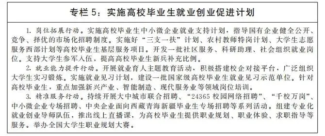 拓宽高校毕业生市场化社会化就业渠道。结合国家重大战略布局、现代产业体系建设、中小企业创新发展,创造更多有利于发挥高校毕业生专长和智力优势的知识技术型就业岗位。健全激励保障机制,畅通成长发展通道,引导高校毕业生到中西部、东北、艰苦边远地区和城乡基层就业。围绕乡村振兴战略,服务乡村建设行动和基层治理,扩大基层教育、医疗卫生、社区服务、农业技术等领域就业空间。为有意愿、有能力的高校毕业生创新创业提供资金、场地和技术等多层次支持。