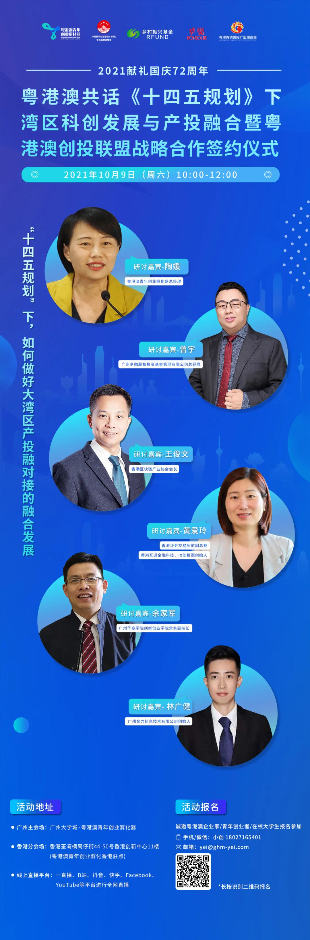 粤港澳青年创业孵化器联合中国国家行政学院(香港)工商专业同学会(“简称CAGA”),携手香港卓悦控股集团、广东乡融股权投资基金管理有限公司、粤澳青创国际产业加速器将于2021年10月9日上午举行“【献礼国庆72周年】粤港澳共话《十四五规划纲要》下湾区科创发展与产投融合暨粤港澳创投联盟战略合作签约仪式”活动,活动邀请粤港澳台四地政府领导、港澳企业家、科创项目投资专家、优秀青年创业者、青年大学生共同参与,旨在促进港澳企业家及青年创业者更好地融入国家发展大局,加强粤港澳产学研协同发展,推进综合性国家科学中心建设,更好地深化粤港澳大湾区科创协同发展,促进大湾区产投融合对接,推动粤港澳科创融合,实现可持续发展。