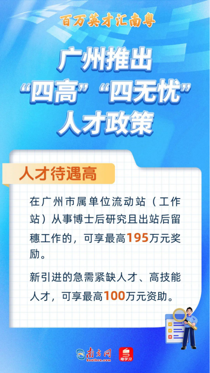 人才待遇高。在广州市属单位流动站(工作站)从事博士后研究,且出站后留穗工作的,科研资助、生活补贴、安家费省市区三级叠加最高可达195万元。新引进的急需紧缺人才、高技能人才,最高给予100万元岗位资助。在荔湾区工作的产业人才,最高给予每年10万元、最长3年薪酬补贴。黄埔高技能人才最高可享30万元奖励。