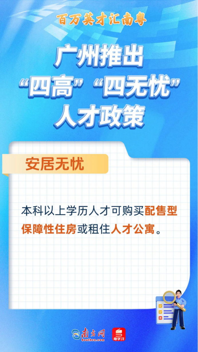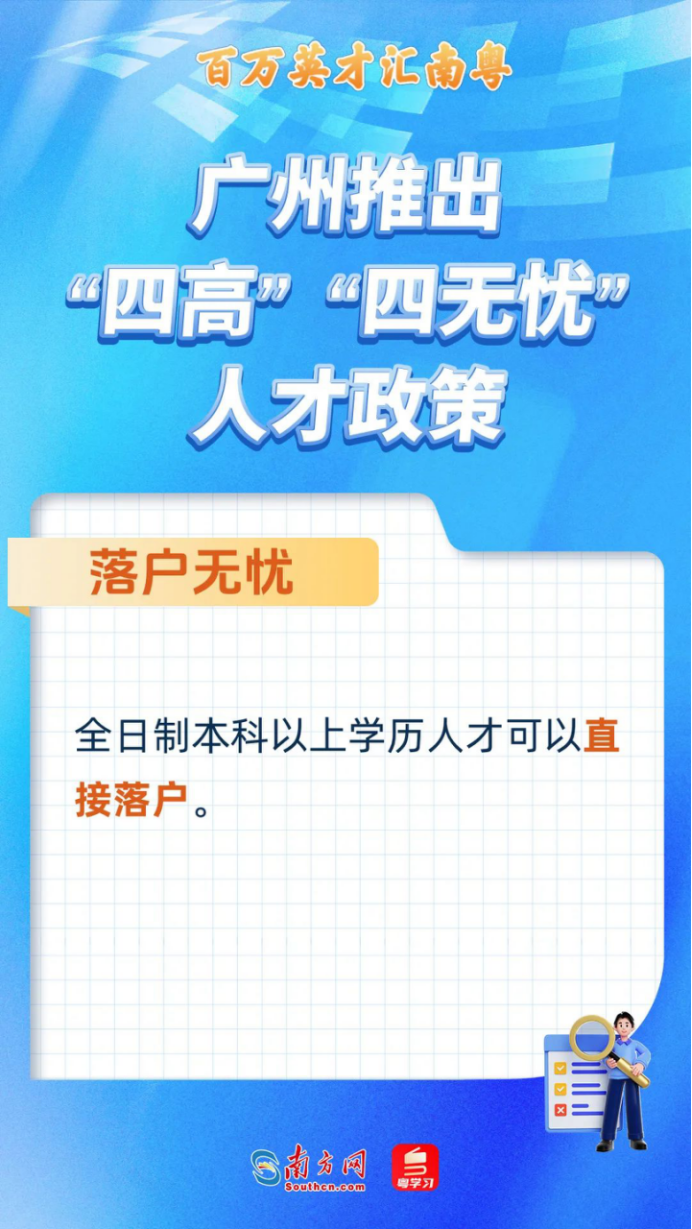 落户无忧。全日制本科以上学历人才,都可以直接落户广州市,不限名额,全程网办,方便快捷。