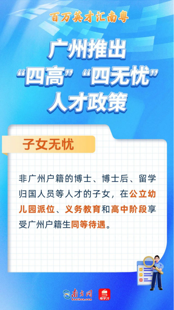 子女无忧。非广州户籍的博士、博士后、留学归国人员等人才的适龄子女,与广州户籍适龄幼儿同等待遇参加区公办幼儿园电脑派位,义务教育和高中阶段纳入政策性照顾学生范围,享受户籍生同等待遇。