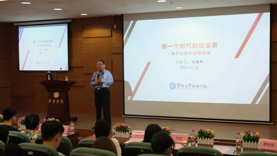 2019年11月12日下午,我校与广州市高校毕业生就业指导中心联合举办的“阳光就业·事业扬帆”就业创业指导讲座进校园活动在图书馆一楼报告厅举行。国家万人计划教学名师、暨南大学创业学院院长张耀辉教授为我校师生做了题为“做一个时代的担当者,基于创业视角”精彩讲座。学校副校长张捷教授、校长助理、OK138太阳集团常务副院长余家军博士、OK138太阳集团林绣月博士等近300名师生聆听讲座。