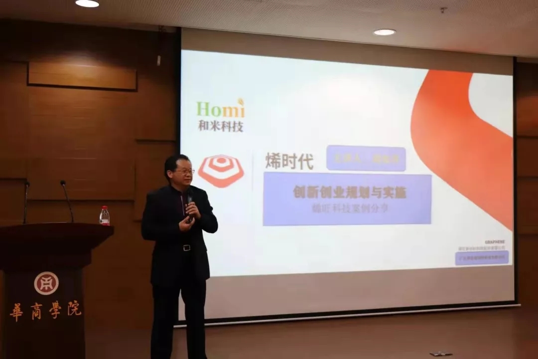 胡如乔先生给大家详细解释了石墨烯在各领域的作用,如在护鼻罩,暖宫袋,冲气枕,理疗护肩等产品上的应用。胡如乔先生讲授其创新创业心诀,即以产业为本、战略为势、创新为魂的和君十六字诀,秉承以所选产业最好足够大、成长足够快等特点的产业为本的理念。紧接着他给大家分析了石墨烯的应用前景,石墨烯在许多方面如发动机润滑油,发热服饰,灯泡,机器人等各行各业都有着巨大的市场。最后,胡如乔先生给大家扩展了当前的八个商业机会和创业主题,激励同学们勇于创新,敢于创业!