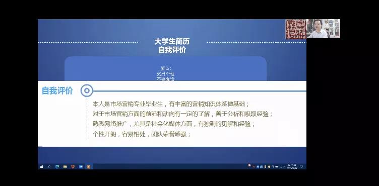 接着于老师为同学们详细地讲解了如何填写简介个人信息,例如姓名、学历、年龄、学历、受教育的程度还有对岗位的匹配度等。还特别提醒同学们要注意态度问题,制作简历时仔细认真严谨,千万不要出现错别字。他提醒要注意审核简历的逻辑性,简介所描述的内容要清晰的呈现出来,各个模板要有较强的逻辑性,不然很可能会被pass掉。