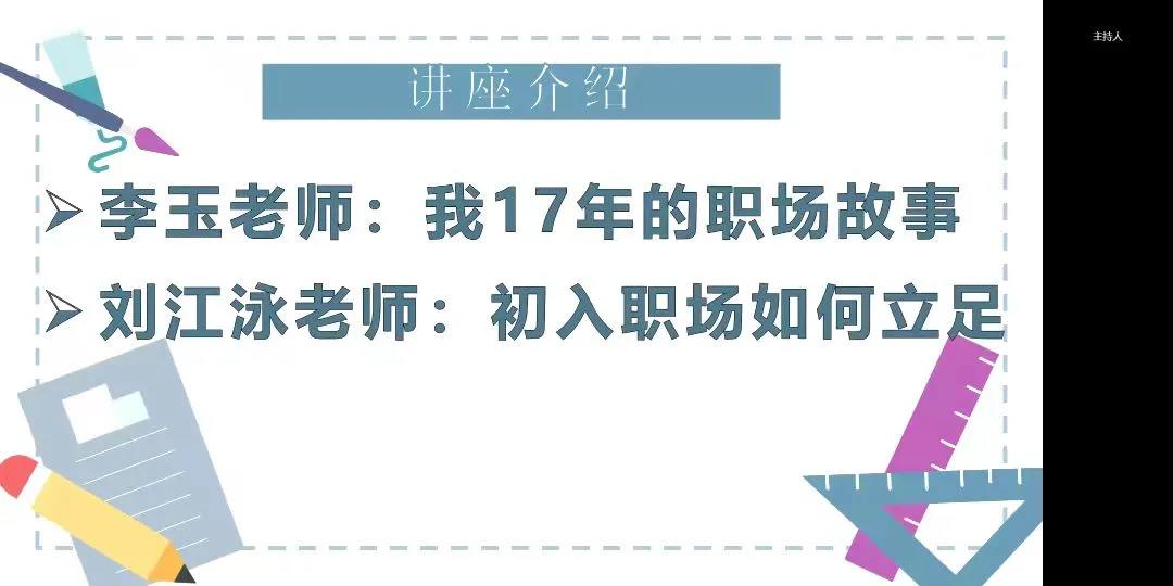 李玉老师向同学们分享了她17年的职场故事,和同学们一起回顾她的成长历程,引用案例分析阐述了初入职场的感悟、稳定发展的感悟以及总结在工作中的要求等。