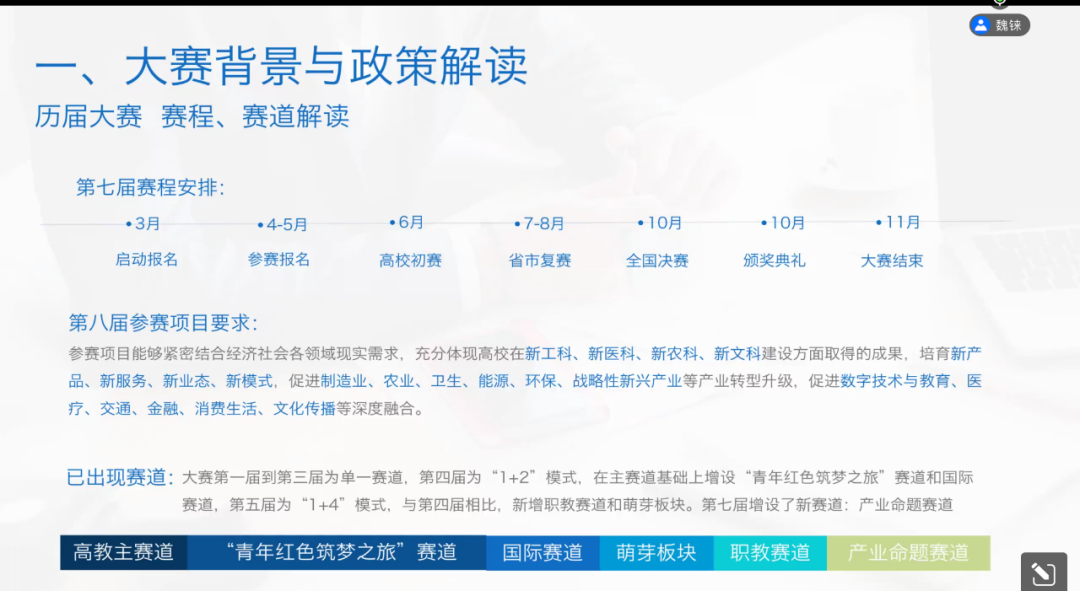 2022年5月7日晚上7:30,由OK138太阳集团组织的创新创业文化节“互联网+”系列专题讲座:双创时代高校创业团队的机遇——第八届“互联网+”大赛赛事辅导在线上顺利举行。本次讲座的嘉宾为信部中小网“百日招聘”企业校招双选活动组委会秘书长,教育部“互联网+”创新创业大赛专家评委,团中央挑战杯创新创业大赛评委,中关村网络教育产业联盟副理事长,职派资讯董事长魏铼。