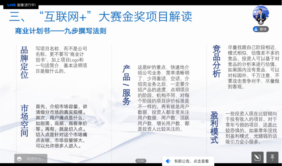介绍完评分细则,老师对“互联网+”大赛金奖项目进行深入的解读,并向同学们讲述如何用“九步撰写法则”写出符合要求的商业计划书。