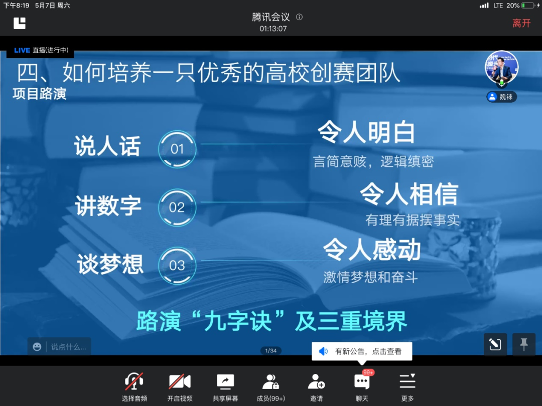 紧接着,老师对备赛的同学提出了几点建议,并分享了项目路演的“九字诀”以及三重境界。