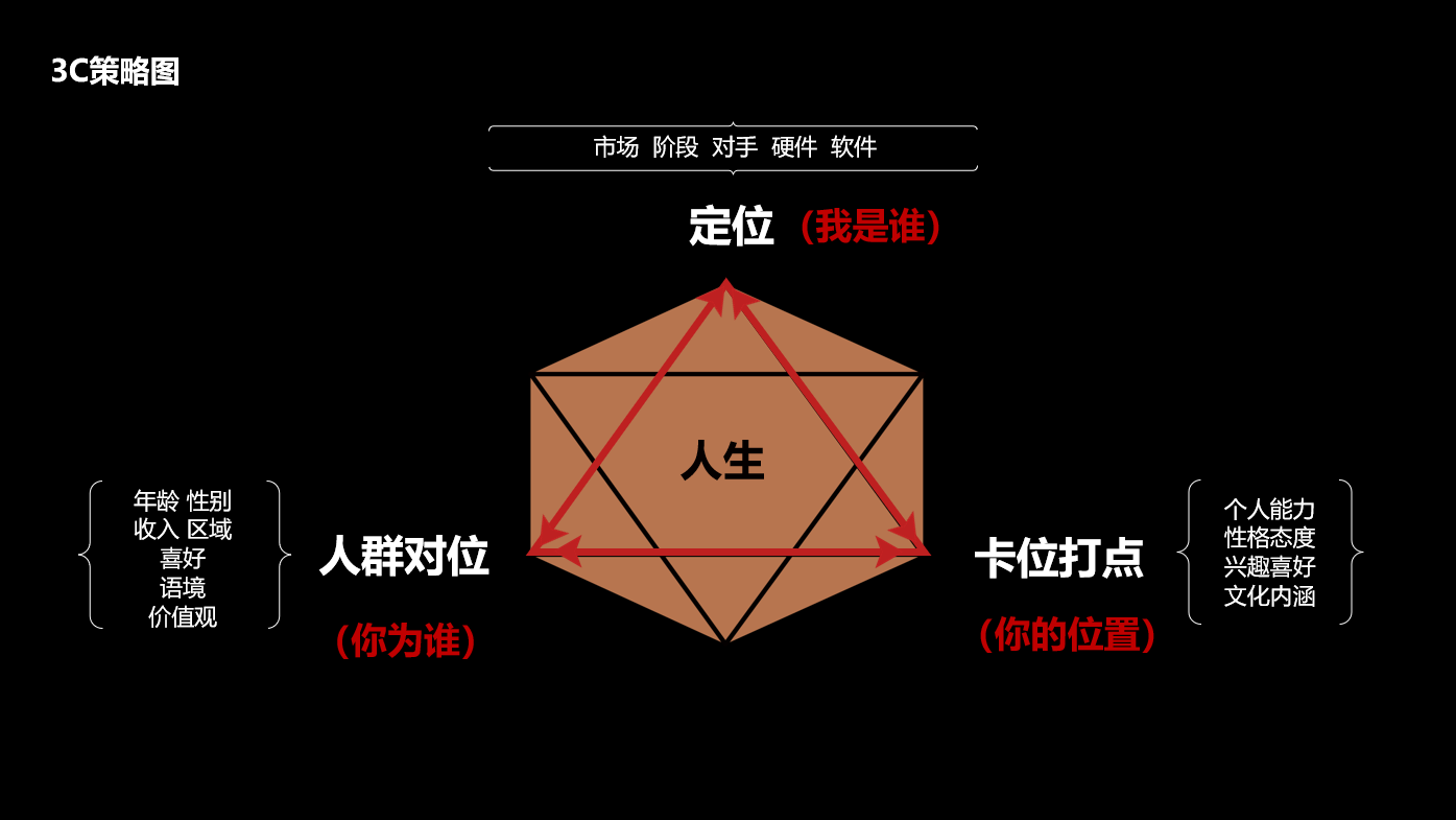 首先,师兄讲述了“人生三角形——3C策略图”的概念,并从人群对位、卡位打点、定位三个角度向我们具体分析如何找准自己的定位。