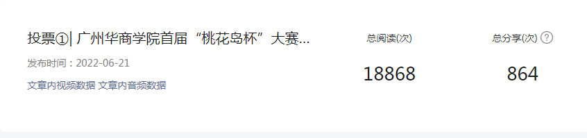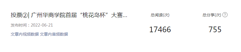 本次大赛由我校与多家单位联合举办,赛事盛大。大赛启动以来,校内累计发布推文17篇次,阅读总量高达41649人次,总分享次数达1792人次,其中单篇推文阅读量高达18868人次,单篇推文分享次数达864人次,形成了较好的宣传效果。本次赛事历时一个月,历经初赛、决赛、选拔。评委阵容强大,囊括多个领域的专家;评选过程采用专家评审+网络选评方式进行,赛程公平公正公开,大赛组委会为呈现一场精彩赛事而不遗余力。