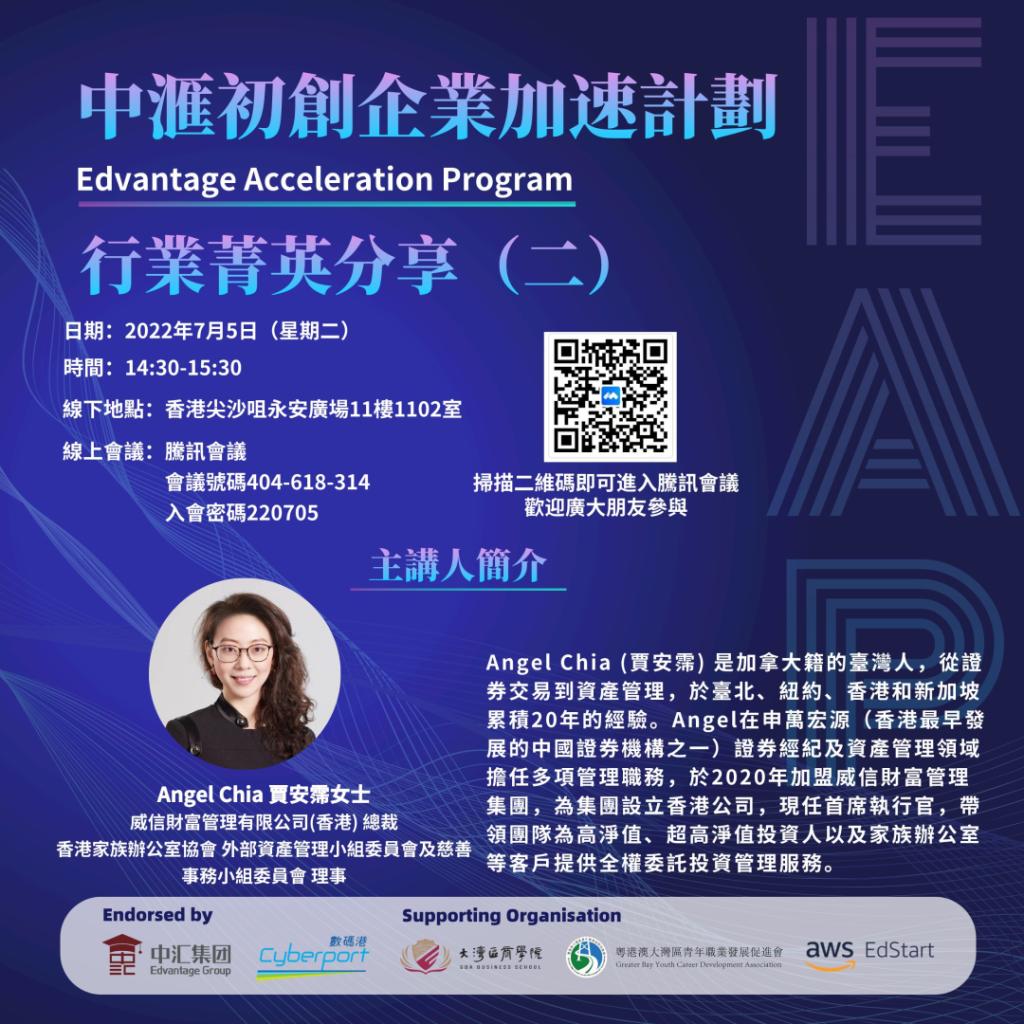 现诚挚邀请各位对教育科技、创新创业感兴趣的企业家、及青年朋友们,参加“中汇初创企业加速计划(EAP)”行业菁英分享(二):“Will fund drop from the sky?Real life guide for founders 资金从天降?一窥新创募资”,了解更多教育及科技行业内创新创业的发展新动向,提升对于证券交易和资产管理等领域的认识。