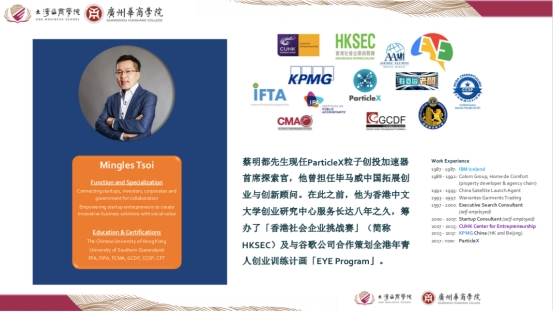 蔡明都先生现任ParticleX粒子创投首席探索官,他曾担任毕马威中国拓展创业与创新顾问。他曾为香港中文大学创业研究中心服务长达八年之久,筹办了社会企业挑战赛及策划全港年青人创业训练计划。蔡先生在促进年轻人创业及社会创新实践方面经验丰富,经常为科技初创比赛及大学的创业支援计划担任专业评审。蔡先生目前是香港天使投资脉络董事会成员、数码港投资者网络委员、香港总商会数码、资讯及电讯委员会委员、香港工业总会之香港初创企业协会委员及创新及科技发展委员会委员、亚洲金融科技师学会学术及资历认证咨询委员会主席。本次大型公益系列讲座由广州华商学院与大湾区商学院(香港)主办,活动得到香港都会大学、广东金融学院、岭南师范学院、广州南方学院、广州新华学院、粤港澳大湾区青年职业发展促进会等40余所粤港澳高校、粤港澳社会组织协助与支持,自2022年4月以来,每隔2-3周推出一讲,所有十讲在2022年12月完成。主讲人为粤港澳知名创业型学者、业界翘楚、创业成功人士。讲座采取腾讯会议和微博同步直播的方式线上举办,后期将陆续推出第七讲《创业比赛经验分享》等其他主题的系列讲座。讲座预告相关信息将在广州华商学院微信公众号等媒体同步刊出。