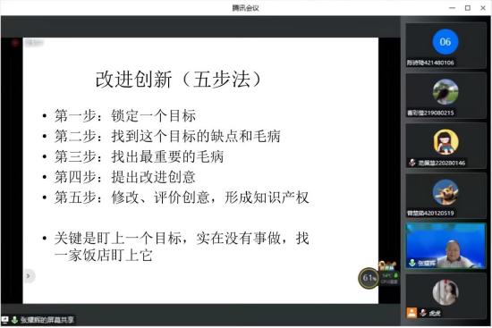 接着,张耀辉教授为大家详细介绍创新方案的改进五步法,由锁定一个目标到提出创意修改,深度剖析了创新的本质,意在提高学生们的思辨能力。此外,张耀辉教授引导学生争做领头羊,掌握独立思考的方法,增强团队协作能力。同时教导同学们积极分享思考结果,促进团队合作,共同进步。