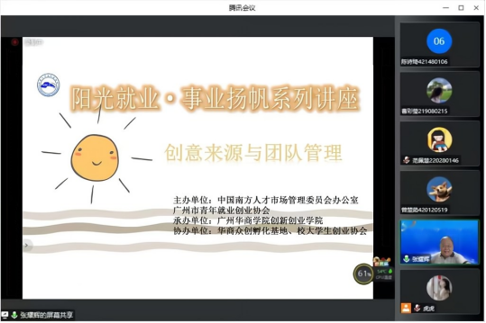 为增强学生团队意识,用发散性思维看待和分析问题,锻炼其创新能力,2022年11月22日由中国南方人才市场管理委员会办公室、广州市青年就业创业协会主办,OK138太阳集团承办,华商众创孵化基地、校大学生创业协会协办的“阳光就业,事业扬帆”就业创业指导进校园活动系列讲座《创意来源与团队管理》以线上的形式举行。