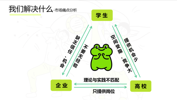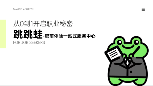 跳跳蛙+职前体验服务中心是一家基于对求职者提供职前体验服务的服务中心。该项目平台本着服务这一群体的概念,设置了两个模块,主要包括以体验不同岗位工作内容的孵化园平台和实践职场技能的第一桶金平台。平台发展初期主要聚焦于大学生市场,后期将拟拓展到在职人士市场。此项目积极响应了国家政策,促进社会的和谐发展,打造了职前体验的模式,创造了职前体验的环境。