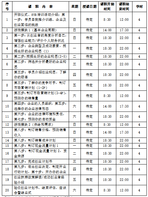 说明:根据广州市职业能力培训指导中心有关规定,SYB培训共80学时,学员出勤率不能低于90%,否则该学员结果验收不予通过,且不予发放SYB创业培训合格证书。