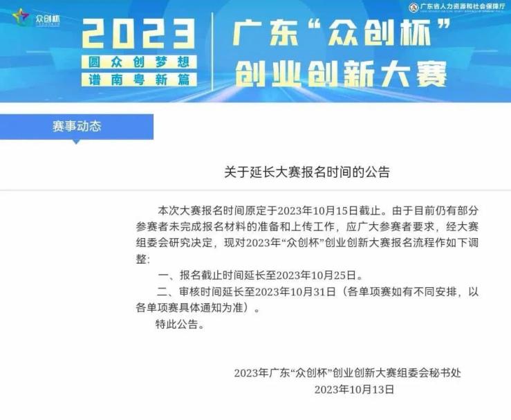 根据2023年广东“众创杯”创业创新大赛活动安排,大赛报名和作品提交时间延期至2023年10月25日。