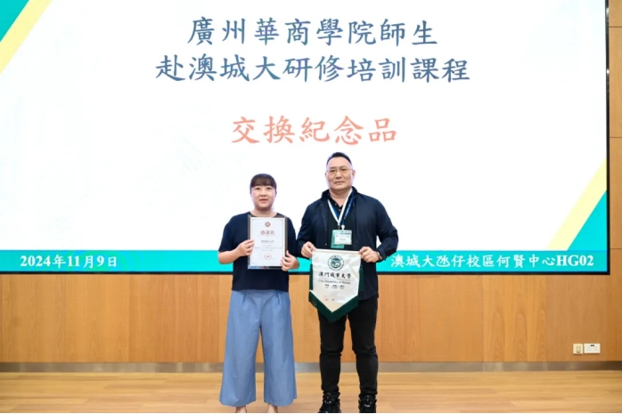 此次讲座为我校师生提供了实用的创业实践方法论,使师生们对商业模式有了更为系统和深入的理解,为师生们在创业过程中应对市场变化、实现企业可持续发展提供了宝贵的借鉴经验。讲座结束后,澳门城市大学国际培训与测试中心为研学团队师生颁发课程结业证书,我校与澳门城市大学国际培训与测试中心交换纪念品。