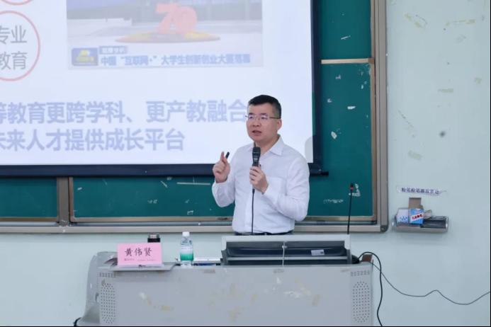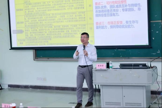 培训伊始,黄伟贤副教授首先对大赛的战略定位、政策导向及赛制创新进行了系统解读。他强调,创新创业教育作为国家产教融合战略的重要实践载体,其核心在于培养具有创新思维与实战能力的复合型人才,而大赛正是检验育人成效、对接产业需求的关键平台。通过横向对比历年赛事数据,黄教授深入剖析了三大核心维度:其一是获奖项目的领域分布与产业政策契合度,揭示出赛事与国家战略同频共振的特征;其二是不同赛道的差异化评审体系,通过解构“创新性”“商业价值”“社会效益”等评分权重,为学生勾勒出精准的备赛路径;其三是基于十年参赛规模增长率、项目落地转化率等核心指标,客观呈现了赛事影响力的指数级提升。