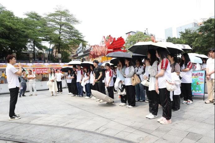 活动首站为佛山创意产业园,作为岭南文化与现代创意交融的典范,园区通过“旧厂新生”模式,将废弃厂房改造为集非遗传承、艺术创作与科技创新于一体的创业孵化平台,成为粤港澳大湾区创新发展的缩影。在解说员的引导下,师生们先后参观了“佛山之心”“25H酒吧街”等标志性场景,深入了解产业园的运营模式与战略规划。独立设计师的扎染服饰、非遗传承人的铜凿剪纸、现调分子鸡尾酒等多元化业态,实现了传统制造业向文化创意产业的转型,展现了“小而美”创业项目的活力,启发了师生对市场细分与商业模式创新的思考。