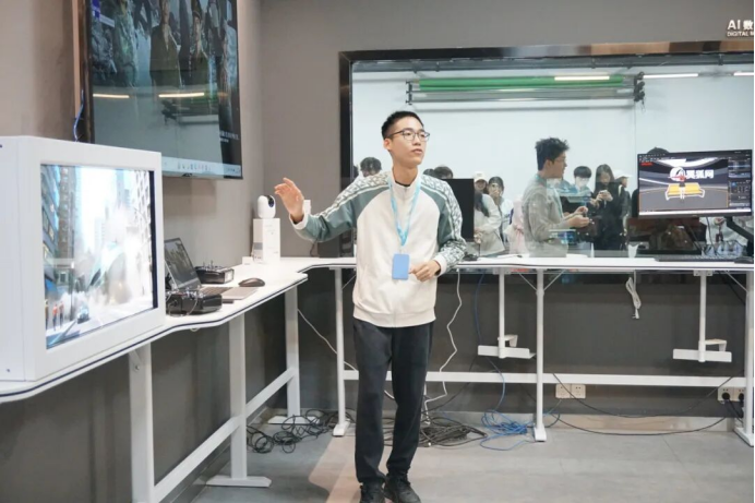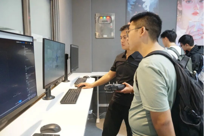 师生团队参观了公司核心技术与业务功能区,现场观摩了无人机飞行演示及相关操作讲解。随后的无人机数智化专项实训中,实操导师系统演示了标准飞行操作流程,重点讲解了“水平8字绕桩”“原地360度自旋”等关键飞行动作的技术要点与安全规范。在实操导师的指导下,师生团队分组开展无人机模拟飞行练习,逐步掌握了无人机飞行操控与航线规划的基本技能。