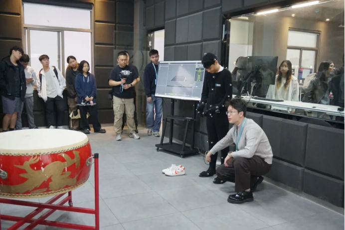 在AIGC与动作捕捉相结合的实训模块。指导教师组织学生进行了AIGC短剧创作实践,从镜头语言的创意构思,到灵活调用各类AI工具生成所需素材,帮助学生逐步将创意构想落地为具象的数字作品。师生团队走进了专业的光学动作捕捉实验室,通过观摩专业演员的动作捕捉全过程,深入了解了电影级动画内容的生成逻辑,并在此基础上,对比分析了AIGC技术相较于传统内容制作流程的优劣势,有效拓宽了学生对行业技术演进路径的认知视野。