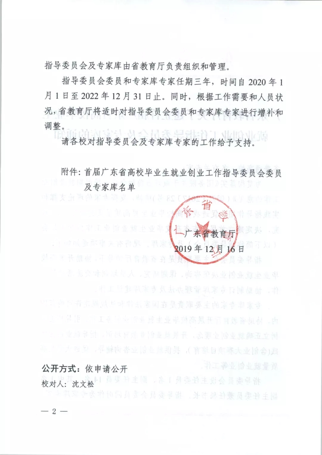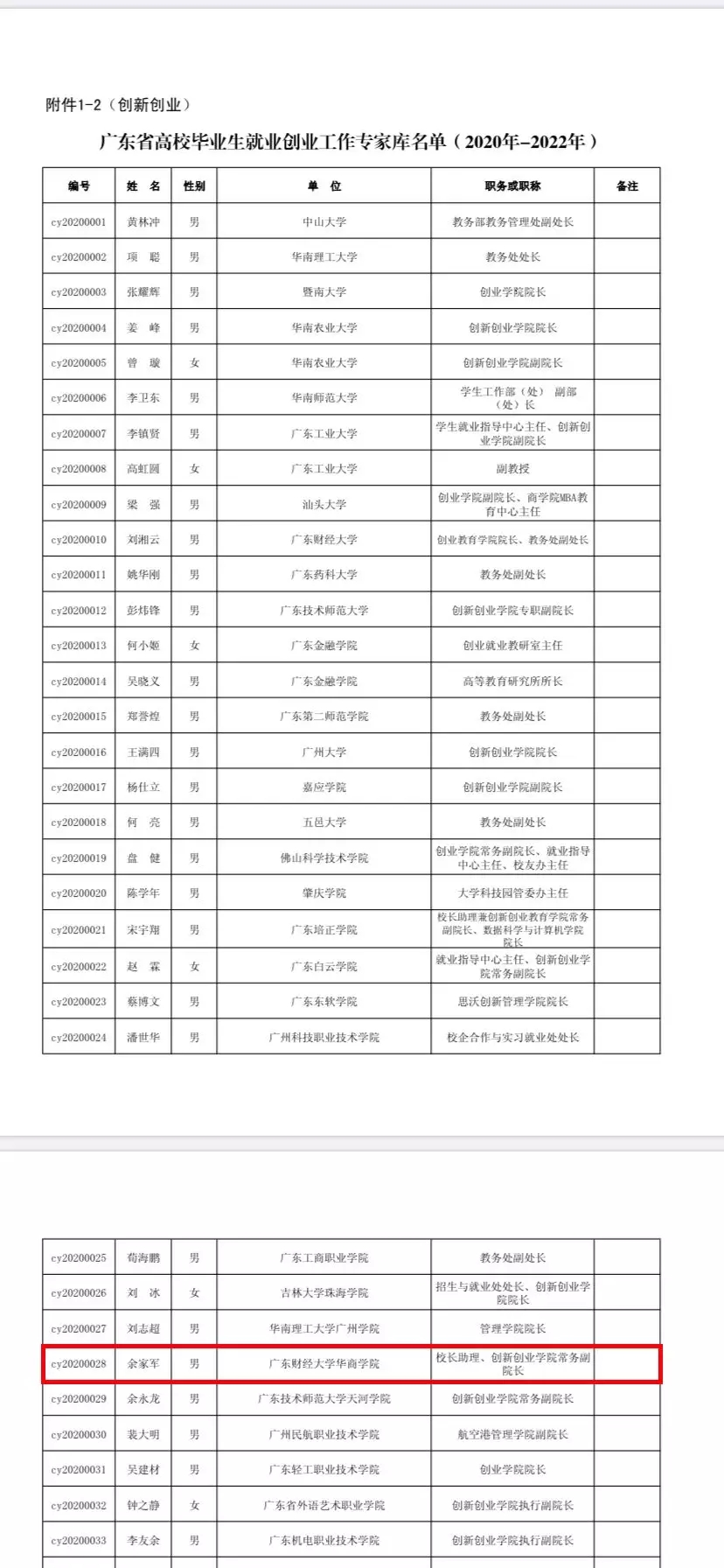 2019年12月16日,广东省教育厅公布了《广东省教育厅关于建立首届广东省高校毕业生就业创业工作指导委员会及专家库的通知》。依据省创业工作专家入选资格条件和流程要求,我校校长助理兼OK138太阳集团常务副院长余家军博士被聘为“广东省高校毕业生就业创业工作专家库专家”,任期三年。