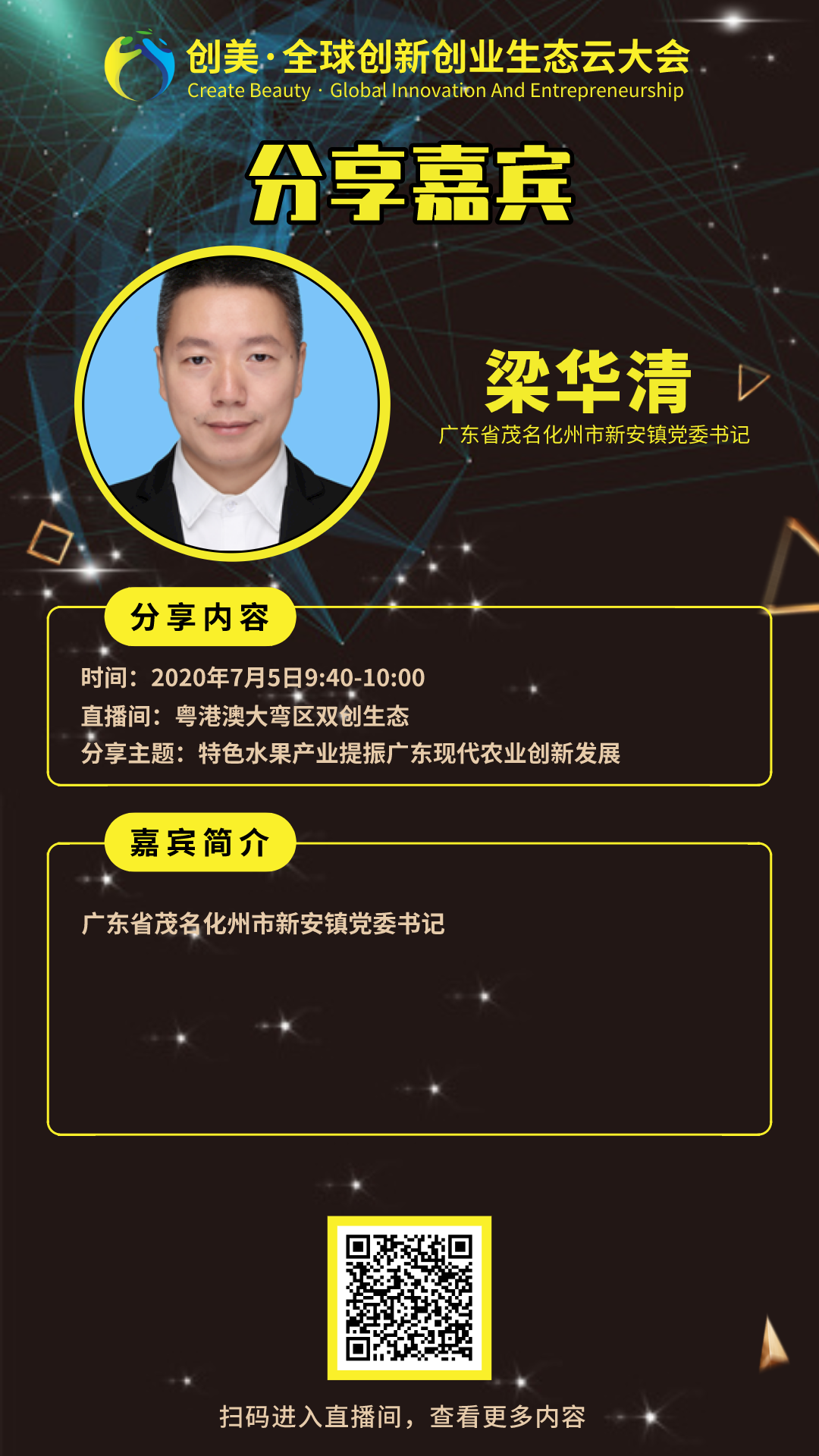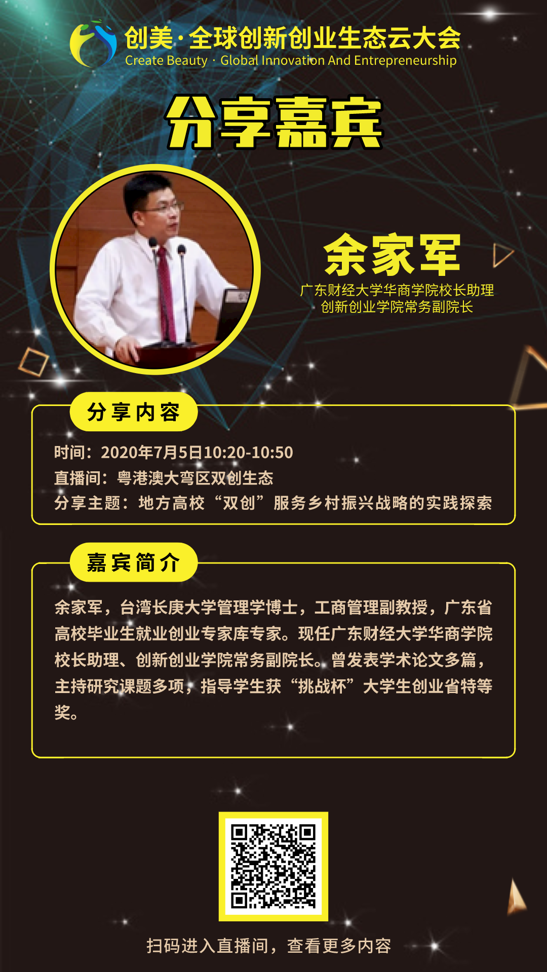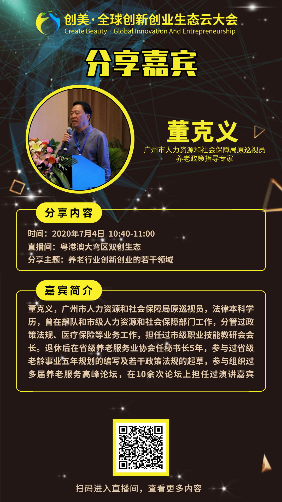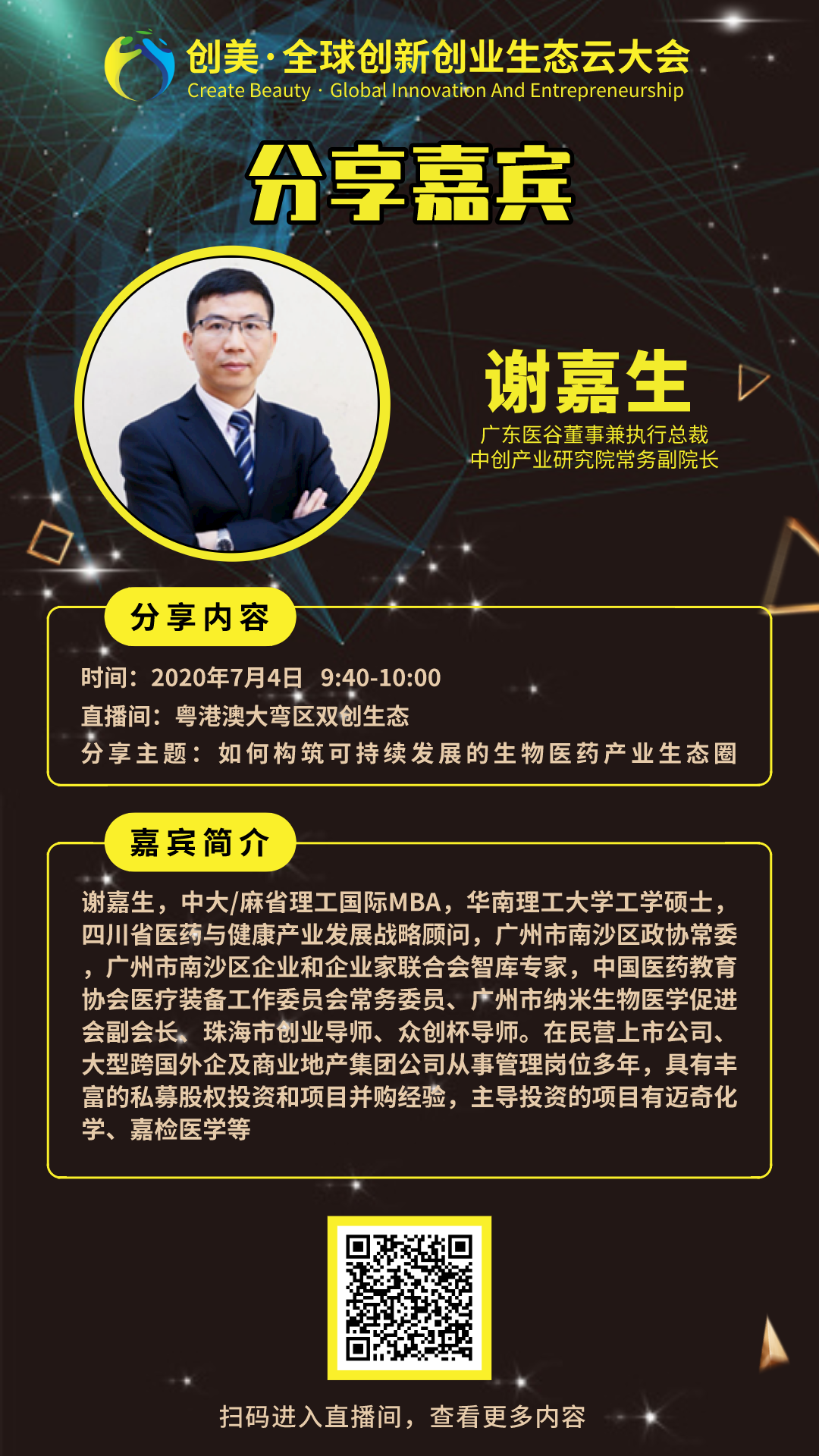 7月4日,创美·全球创新创业生态云大会粤港澳大湾区双创生态模块将正式开幕,20余个主题,包括生物医药、养老行业、现代农业、高校双创等多个话题,由多位深耕于这些领域的学者、企业家、政府工作人员进行展示。这将是一次关于粤港澳大湾区双创活动的生态展示和深度经验分享!