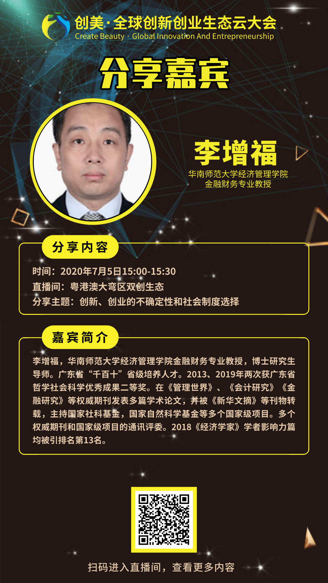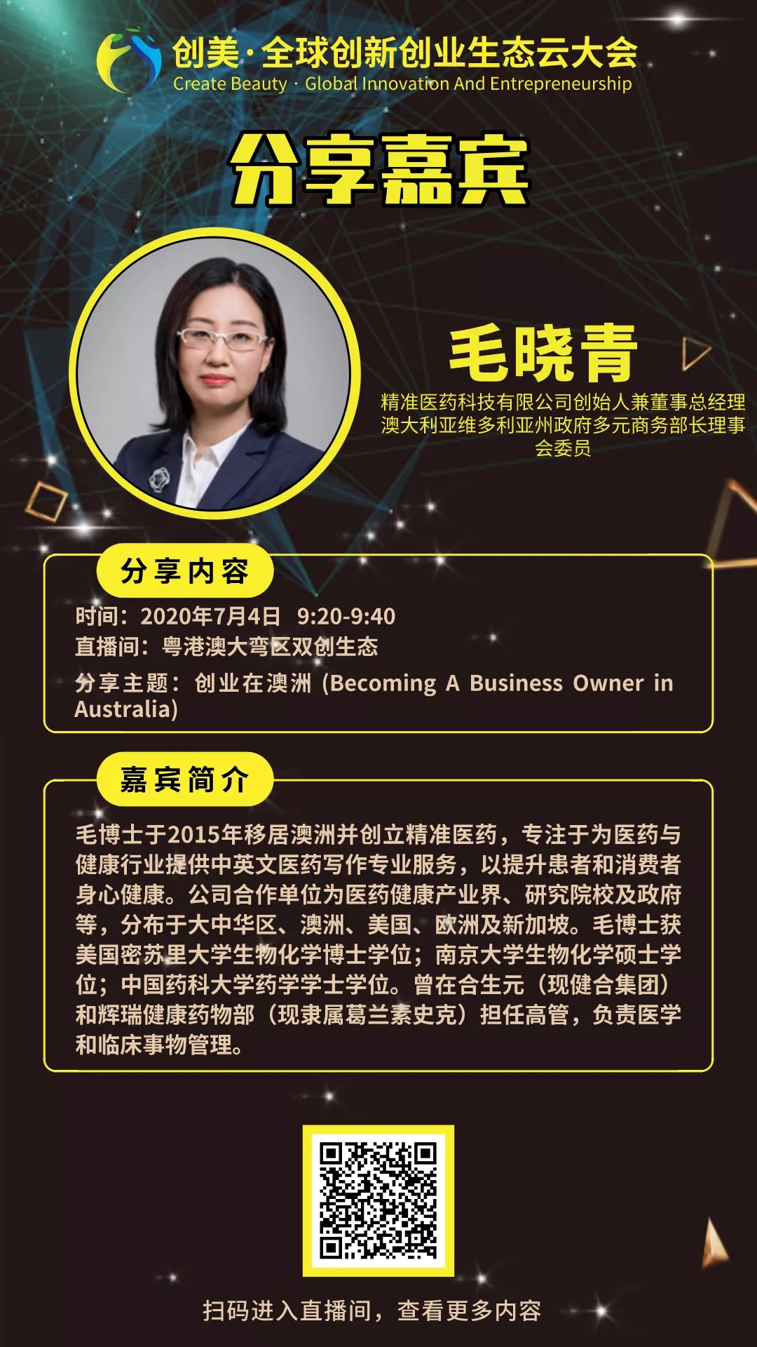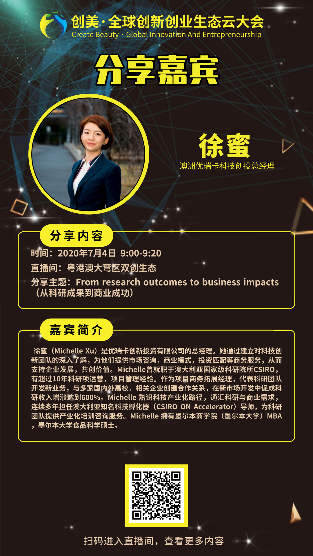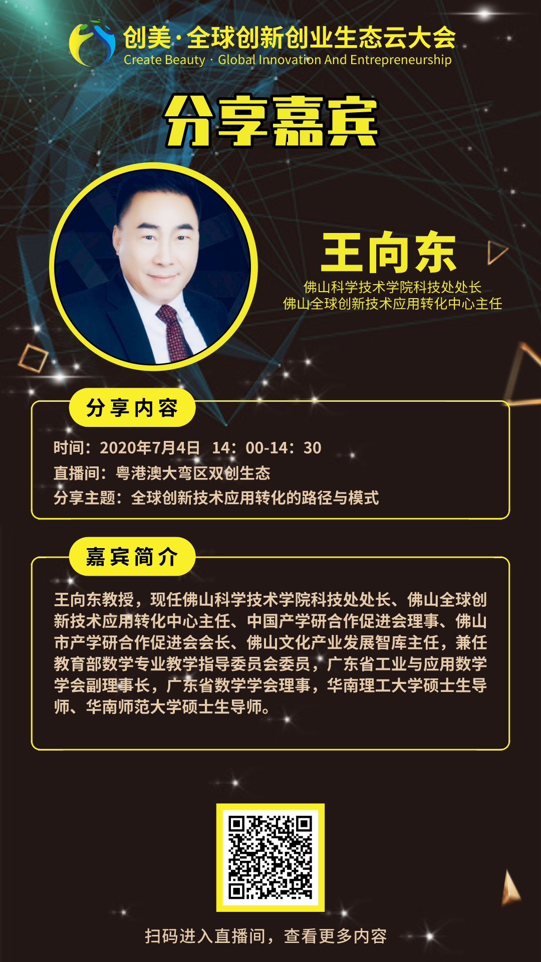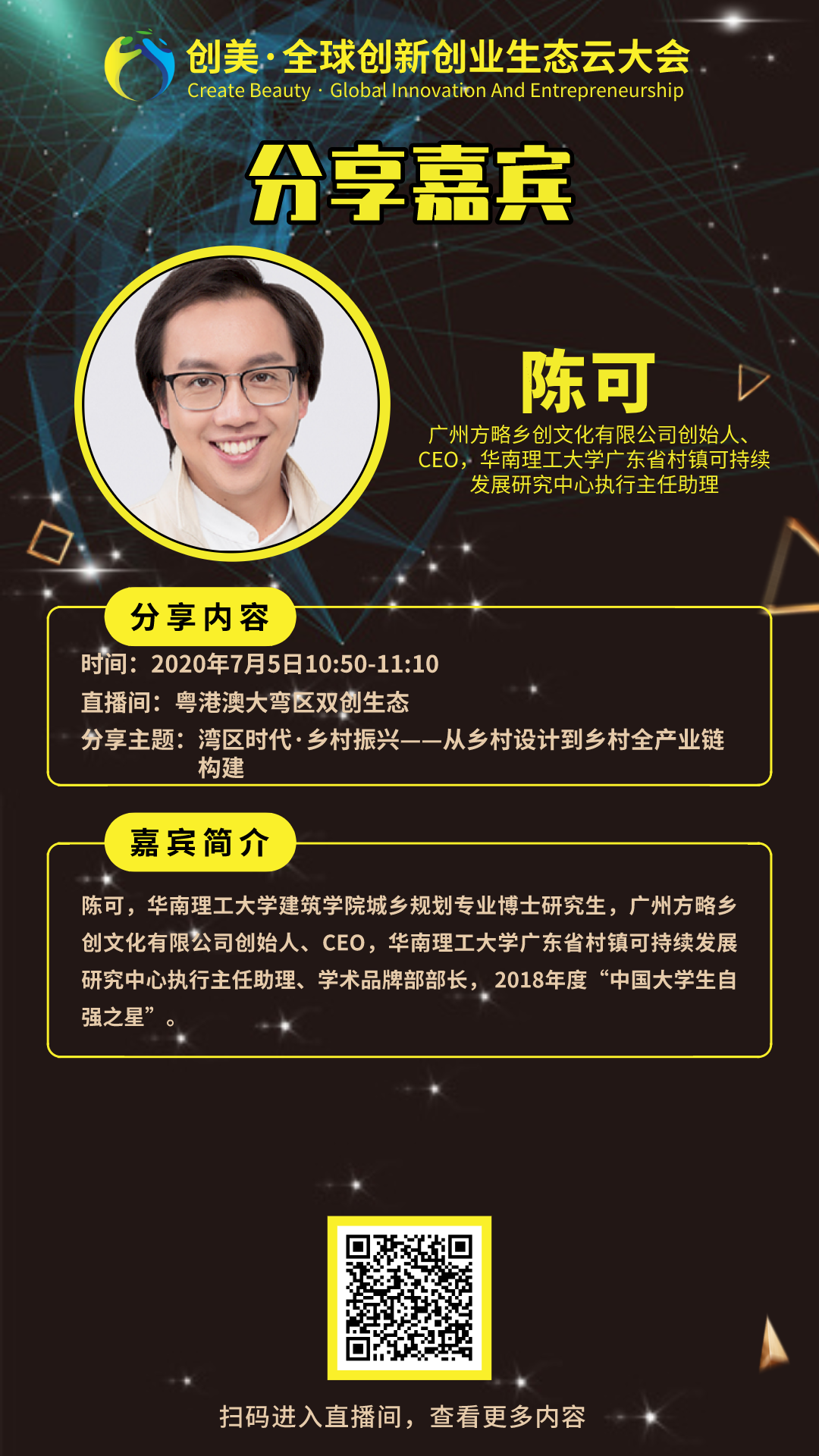 7月4日,创美·全球创新创业生态云大会粤港澳大湾区双创生态模块将正式开幕,20余个主题,包括生物医药、养老行业、现代农业、高校双创等多个话题,由多位深耕于这些领域的学者、企业家、政府工作人员进行展示。这将是一次关于粤港澳大湾区双创活动的生态展示和深度经验分享!