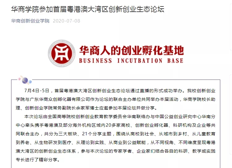为进一步促进华商创新创业教育工作发展,学校建设创新创业实践基地,制定一系列的创新创业质量管理、优胜劣汰的健康发展机制;2020年4月注册成立广东华商科技创新创业基地并以广东华商众创孵化器有限公司作为运营主体。2020年7月23日,经广州科技企业孵化协会第三届理事会10次会议审议通过,广东华商众创孵化器有限公司荣幸正式成为协会会员单位,未来华商众创孵化器将与其他优秀的会员单位进广泛交流与合作,拓展孵化器和众创空间创新创业发展新理念,与其他会员单位共同进步,共同成长。