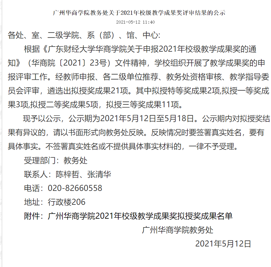 根据《ok138cn太阳集团华商学院关于申报2021年校级教学成果奖的通知》华商院〔2021〕23号)文件,《民办高校大商科学生创新创业能力协同培养的探索与实践》荣获广州华商学院2021校级教学成果奖特等奖。