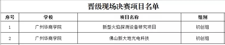 近日,广东省教育厅公布的第七届中国国际“互联网+”大学生创新创业大赛广东省分赛现场决赛名单中,广州华商学院《新型火焰探测设备研究项目》和《佛山新大地光电科技》两个项目从全省各高校参赛项目中脱颖而出,晋级广东省分赛现场决赛,将在8月10日-12日参加省决赛与其他高校共同角逐本届金、银奖。