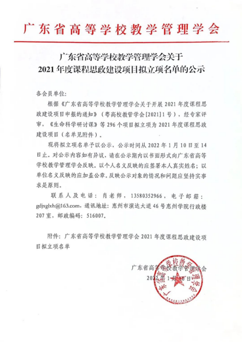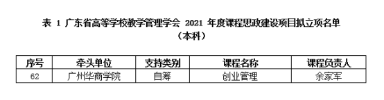 根据《广东省高等学校教学管理学会关于2021年度课程思政建设项目申报的通知》(粤高校教管学会[2021]1号)文件要求,经专家评审,广州华商学院《创业管理》课程获得广东省2021年度课程思政建设项目立项。