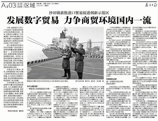 日前,省商务厅公布了广东省进口贸易促进创新示范区和培育区名单。东莞市沙田镇与广州市黄埔区、深圳市前海蛇口自贸片区等6个区域被评为全省首批进口贸易促进创新示范区(下称“示范区”)。其中东莞市沙田镇进口贸易促进创新示范区相关申报工作由广州华商学院与沙田镇政府共同合作完成,示范区一经获批,便受到了“南方日报”等媒体的关注报道。