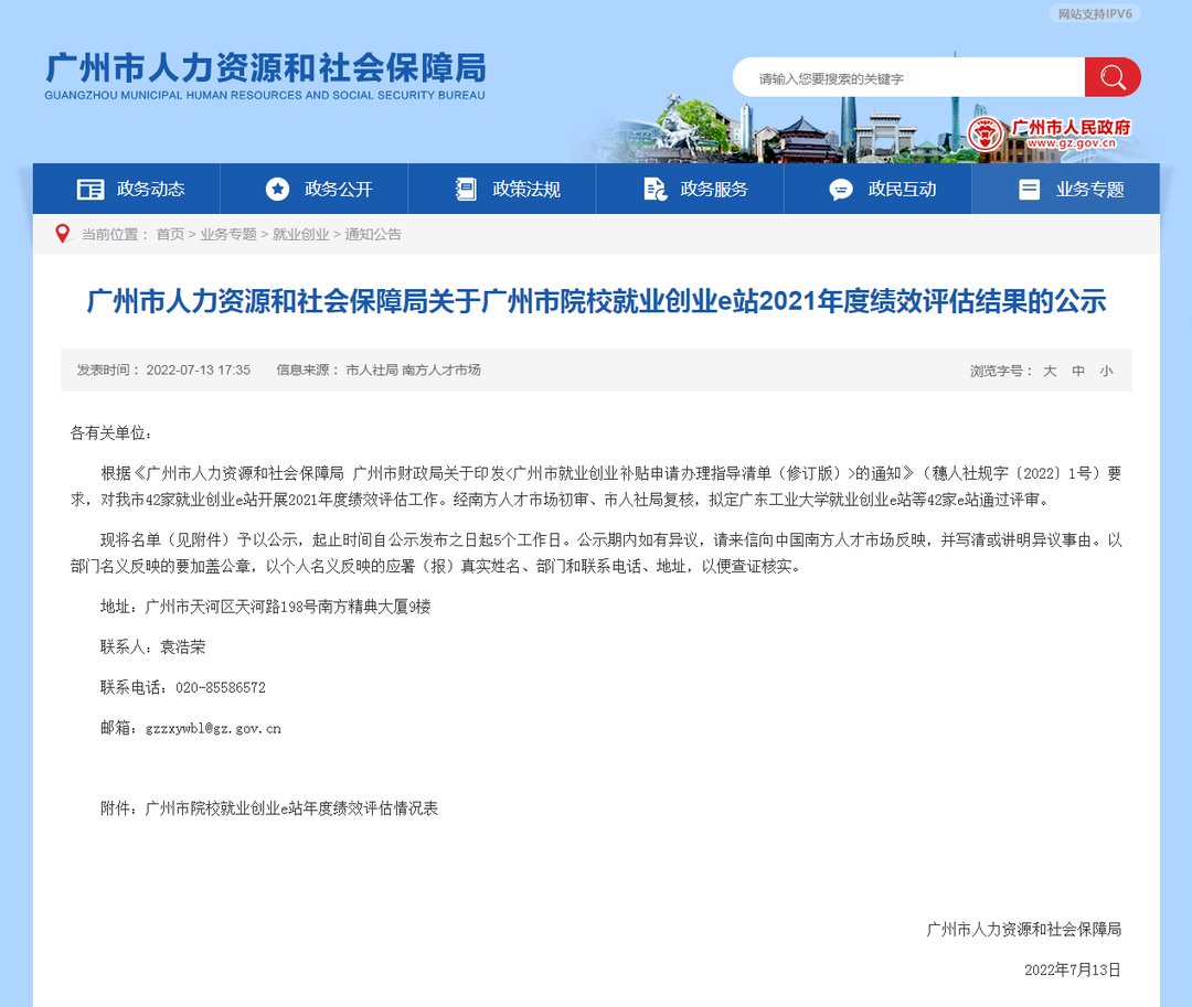根据《广州市人力资源和社会保障局 广州市财政局关于印发<广州市就业创业补贴申请办理指导清单(修订版)>的通知》(穗人社规字〔2022〕1号)要求,对我市42家就业创业e站开展2021年度绩效评估工作。经南方人才市场初审、市人社局复核,广州华商学院就业创业e站通过评审。