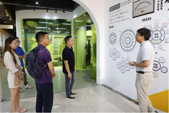设界科技集团大湾区总经理冯永强陪同彭秀东教授一行参观设界展厅。他表示,设界作为广东省全域产业创新研究院合作单位之一,也在积极推进企业数字化转型。据他介绍,时尚趋势赋能纺织行业数字化转型升级,设界时尚产业创新服务综合体依托POP趋势、时创教育、优料宝、YIWAY新品制造局、全国各地产业地设界五大时尚产业平台,打造以“趋势+面料+设计+培训+展贸+数据”为服务体系内容的大数据数字时尚产业服务综合体,致力于为纺织行业提供时尚产业孵化配套综合服务。