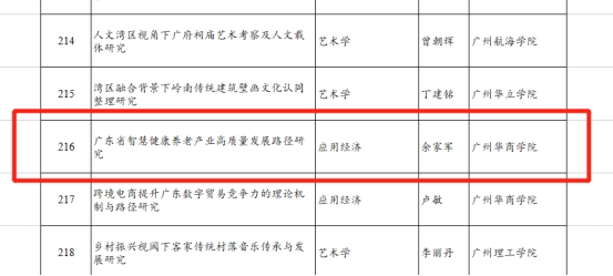 近日,广东省社科规划2022年度学科共建项目立项名单公布,我校余家军老师主持的“广东省智慧健康养老产业高质量发展路径研究”项目位列其中。