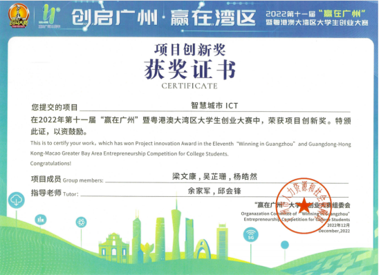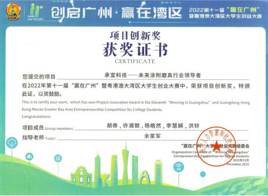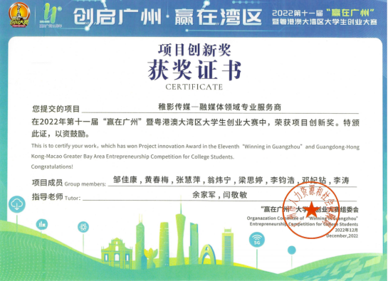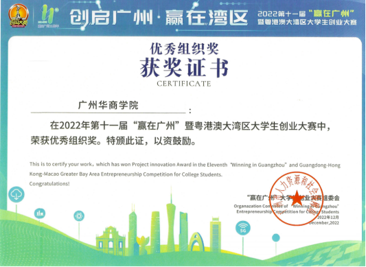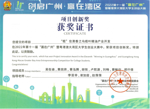 由广州市人力资源和社会保障局主办,中国南方人才市场管理委员会办公室承办的2022年第十一届“赢在广州”暨粤港澳大湾区大学生创业大赛已圆满落幕,广州华商学院《"榄"住清香之乌榄叶精油产业开发》《稚影传媒-融媒体领域专业服务商》《承宣科技--未来涂附磨具行业领导者》《智慧城市ICT》《藏香阁--中药香水》5个项目均荣获“项目创新奖”,我校荣获“优秀组织奖”。