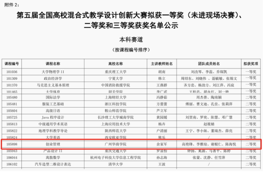 近日,第五届全国高校混合式教学设计创新大赛组委会公布了入围现场决赛与获得一等奖(未进现场决赛)、二等奖和三等奖的名单。广州华商学院《创业管理》课程喜获第五届全国高校混合式教学设计创新大赛(本科赛道)二等奖。