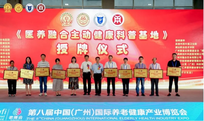 杨群祥执行董事、余家军校长受邀作为论坛主办方代表,分别为广东省水电医院、广州港颐康医院等18家单位颁发“医养融合主动健康科普基地”牌匾。