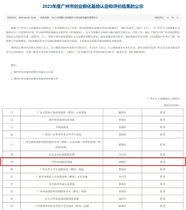 根据《广州市人力资源和社会保障局广州市财政局关于印发广州市创业孵化基地管理办法的通知》(穗人社规字〔2022〕3号)、《广州市人力资源和社会保障局关于开展2023年度广州市创业孵化基地认定和评价工作的通知》,广州市人力资源和社会保障局通过组织开展认定、评价工作,确定了2023年度广州市创业孵化基地认定和评价结果。华商众创孵化基地在2023年度广州市创业孵化基地评价中获评“优秀”!