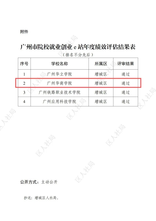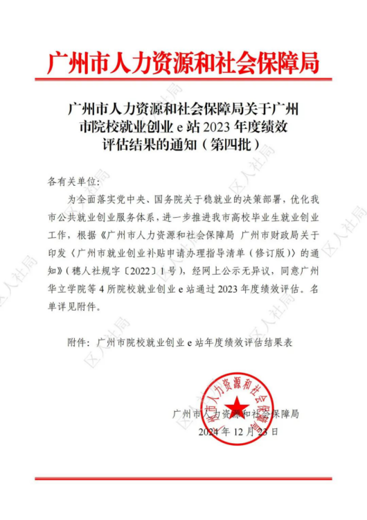 2024年12月23日,根据《广州市人力资源和社会保障局 广州市财政局关于印发〈广州市就业创业补贴申请办理指导清单(修订版)〉的通知》(穗人社规字〔2022〕1 号),经网上公示无异议,同意广州华商学院就业创业e站通过 2023 年度绩效评估。
