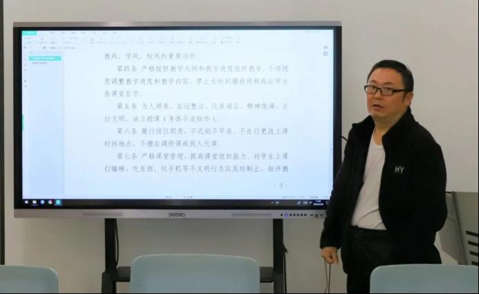 谢根仁院长助理传达教学制度相关文件精神。他表示,与会教师要坚定政治立场,遵守法律法规,严谨治学,严格按照教学大纲组织教学,不得随意调整教学进度和内容,注重仪表仪态,履行岗位职责,严格课堂管理并做好学生考勤。
