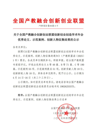2025年4月14日,按照《全国产教融合创新创业联盟创新创业创造学术年会优秀论文、示范案例、创新人物征集的通知》(产教联盟函〔2025〕1 号)要求,经全国产教联盟专家组评议,广州华商学院“借个胆儿——借个胆儿助力海胆产业一体化高质量发展”案例获评全国产教融合创新创业联盟创新创业创造学术年会示范案例,广州华商学院余家军教授获评全国产教融合创新创业联盟创新创业创造学术年会“创新新锐人物”。