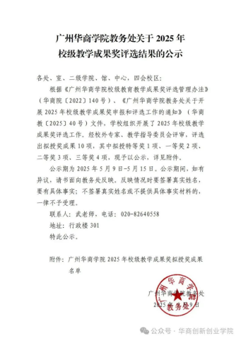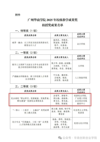 根据《广州华商学院校级教育教学成果奖评选管理办法》(华商院〔2022〕140号)、《广州华商学院教务处关于开展2025年校级教学成果奖申报和评选工作的通知》(华商教〔2025〕40号)文件,经校外专家、教学指导委员会评审,拟授奖成果10项,其中《民办高校“职业牵引、创新赋能、实践贯通、孵化增值”创新创业课程体系》荣获广州华商学院2025年校级教学成果奖二等奖。
