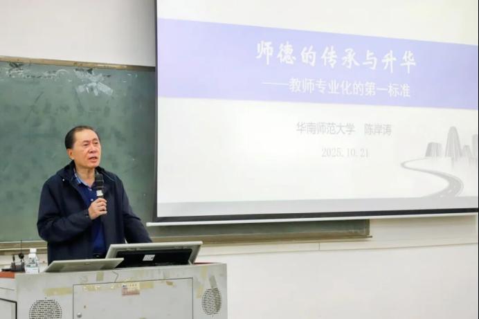 随后,华南师范大学陈岸涛教授作《师德的传承与升华——教师专业化的第一标准》专题培训。陈教授深入剖析了当前教师职业面临的机遇与挑战。他结合高等教育普及化、生源结构变化及人工智能快速发展等时代背景指出,随着国家经济社会高质量发展和教育强国战略的深入推进,社会对教师素质提出了更高要求。面对未来可能因师德失范、学历职称不达标、AI应用能力不足等产生的职业风险,教师应增强忧患意识,主动适应变革,将持续学习和自我提升作为职业发展的关键。