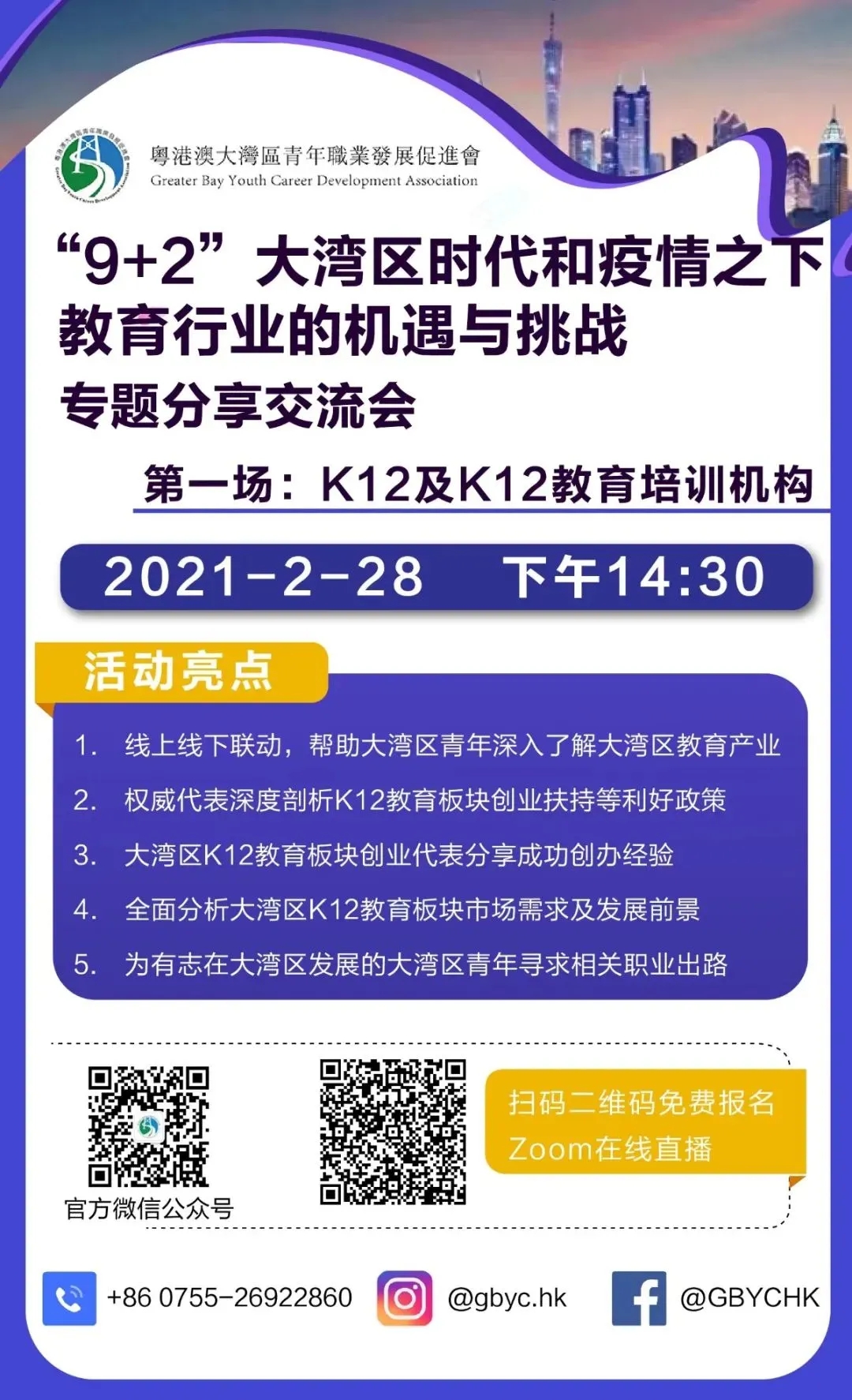 本次活动旨在共同探讨疫情之下K12教育板块的机遇与挑战,为有志在“9+2”大湾区寻求相关职业出路的大湾区青年分享宝贵经验,共同助力大湾区发展,热烈欢迎各位大湾区青年线上参与本次交流会,之后还有其他的活动会陆续推出,希望大家多多关注!