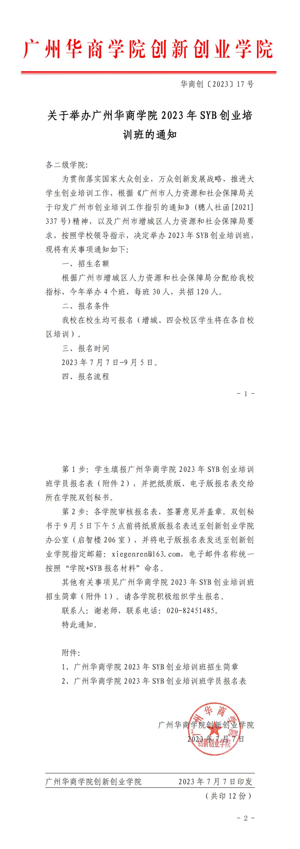 关于举办广州华商学院2023年SYB创业培训班的通知