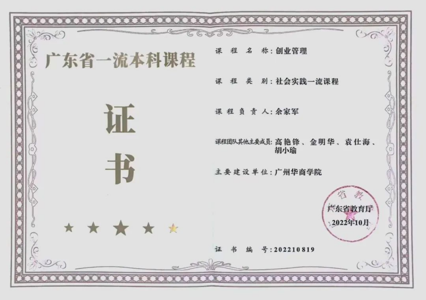 《创业管理》课程被认定为广东省一流本科课程,获省级课程思政试点建设项目立项,成功在“学银在线”上线。《民办高校<创业管理>课程教学改革研究》课题获广东省教育厅2022年度广东省本科高校教学质量与教学改革工程项目立项。《创业管理》课程作为优质课程思政案例,已成功上线新华网“新华思政”-全国高校课程思政教学资源服务平台。